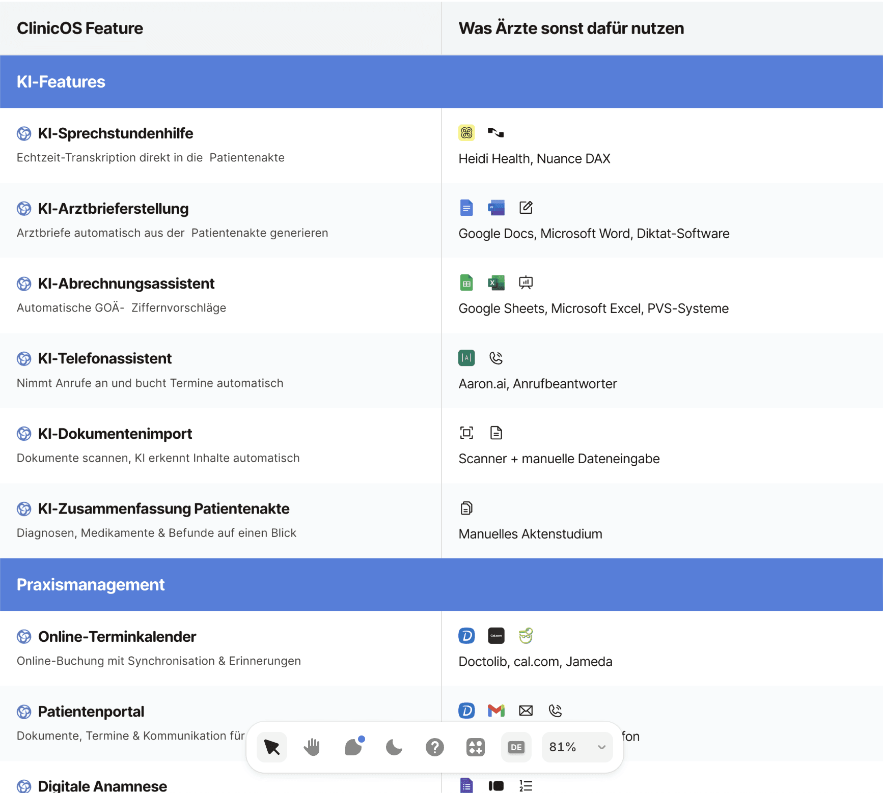 Statt 10+ verschiedene Tools zu jonglieren — eine Plattform für alles. Speziell für Arztpraxen entwickelt, Made in Germany.